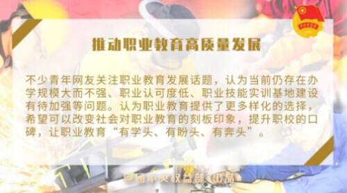 不少青年网友关注职业教育发展话题,认为仍存在办学规模大而不强、职业认可度低、职业技能实训基地建设有待加强等问题。认为职业教育提供了更多元化的选择,希望改变社会对职业教育的刻板印象,提升职业学校的美誉度,让职业教育“学有所成,向前看,向前看”。