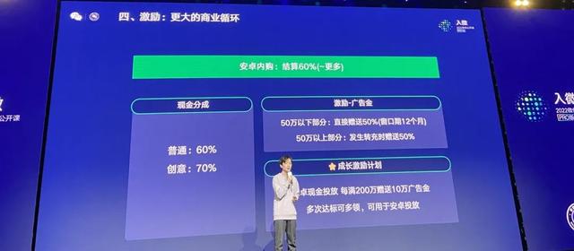 说完了广告变现,我们再来看看Android的内容。在小游戏的成长计划中,我们始终坚持一个政策,我们支持针对中小游戏的调优,然后我们放大潜在的优质游戏。所以在安卓应用内游戏中,我们可以获得60%的现金分成,还可以获得广告激励。如果游戏单月月流量小于等于50万,我们会直接划拨50%的优化广告费,这部分优惠广告费直接给,你每个月结算的时候点击领取即可。
