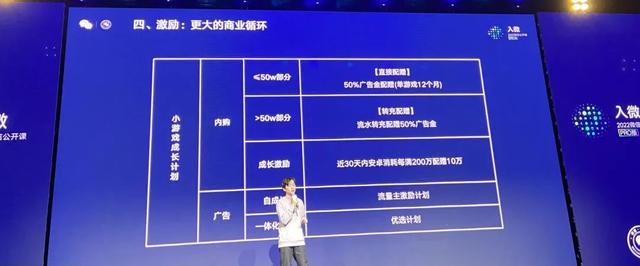 而当你的内购流量在50万以上时,除了享受刚才说的内容,还有广告费的转移。充值广告金刚刚还提到,帮你做5天资金流,然后享受一个转二送一的过程。但这里也必须提到,过去我们观察到一些小游戏为了享受50万以下的直接赠送,在游戏内容深度上缺乏打磨,游戏整体月流水长期维持在较低水平。为了优化这部分激励资金的使用效率,鼓励大家在游戏的内容深度和内容质量上做得更好,我们为50万以下的奖金设置了新的12个月的窗口期,也就是说从游戏月流水第一次大于等于10000元开始直接发放奖金,享受12个月后停止发放。整个政策也将从2022年4月开始执行,届时我们购买并在内部结算。与此同时,我们正式发布了新的增长激励计划,将在本周进行详细说明。