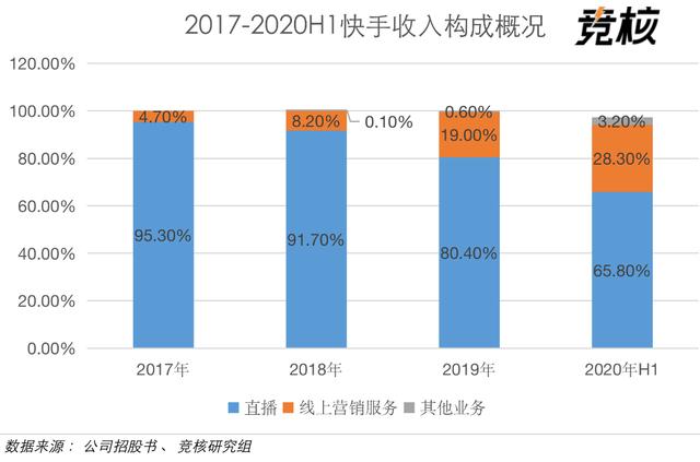 直播业务:2017年至2020年H1,Aauto更快的直播收入占比分别为95.3%(79.5亿元)、91.7%(186.2亿元)、80.4%(314.4亿元)、68.5%(173.5亿元)。