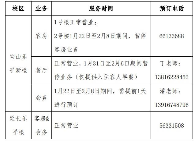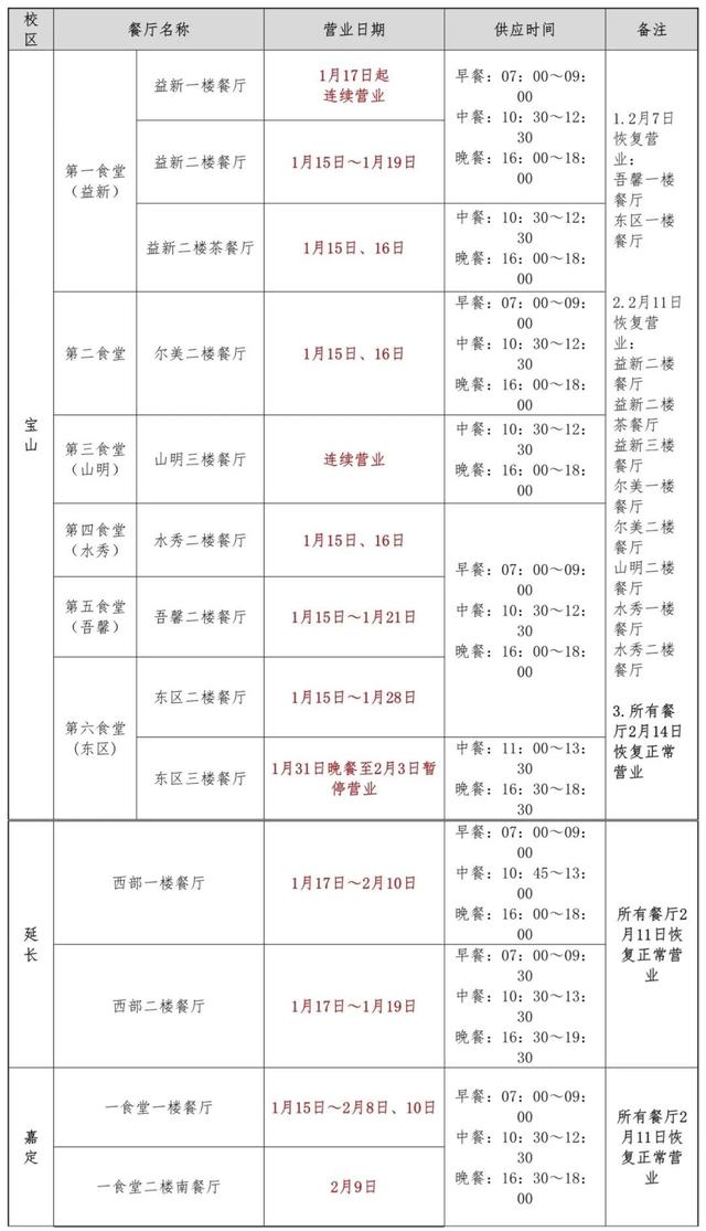 备注:寒假期间,东区三楼对师生全面开放。同时,在节假日期间,餐饮中心会根据就餐情况适当调整商务食堂。如有调整,将另行通知。