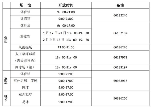 春节假期期间,1月31日至2月3日室内场馆全部关闭,2月4日至5日开放时间为9: 00至16: 00(游泳馆除外)。