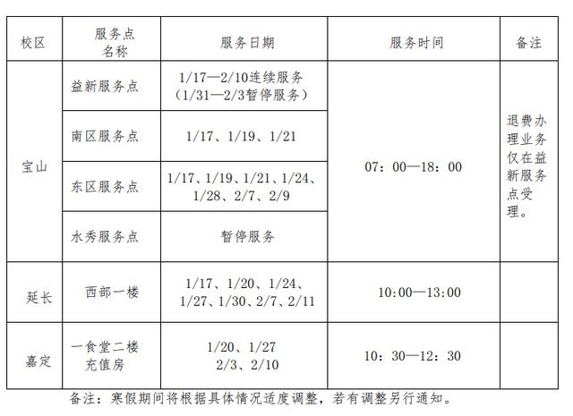 寒假期间,现场办理业务的相关安排如下表所示。如有调整,以校园网和中心最新公告为准。