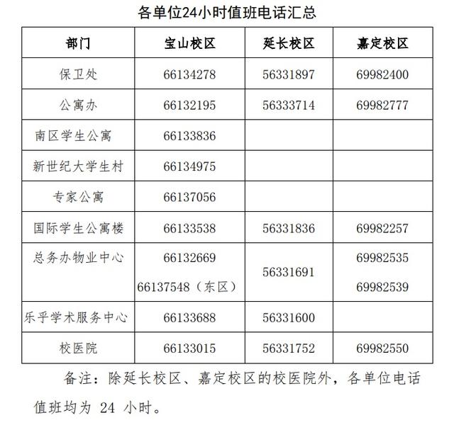 备注:保卫处负责全校应急处理,师生救助,外来车辆进出校门登记。24小时值班电话:66134278(宝山校区);6331897(校区扩建);6982400(嘉定校区)。