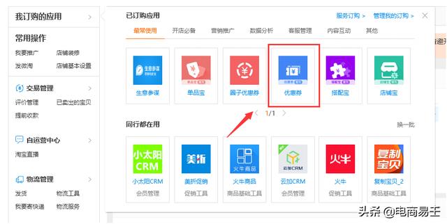 第二步:订单完成后,在卖家中心找到优惠券——我点的应用——我点的应用,点击设置店铺优惠券。