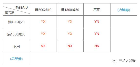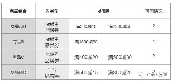可用性:商品组合中各种可用优惠券有多少种选择?一般只能使用一张同类型的优惠券,但也可以使用两张同类型的优惠券。这就涉及到数学组合的概念了。比如商品A/B可以用至少300减10或者至少1300减50或者两件,那么有三种可用的情况。