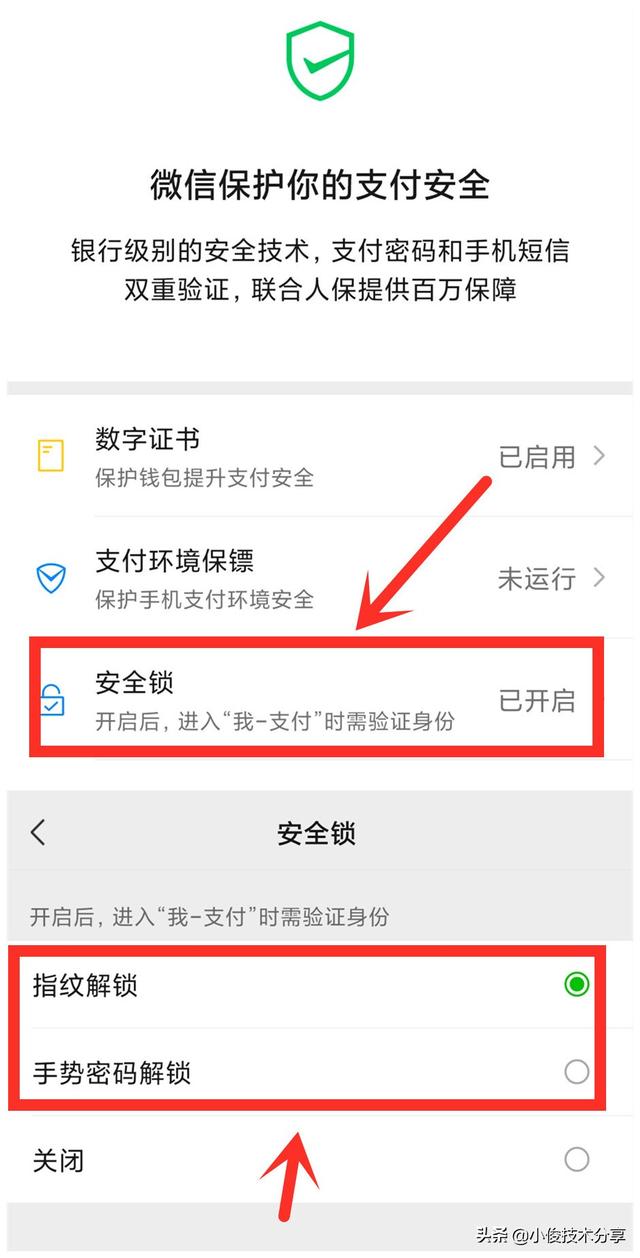然后打开【安全】中的【安全锁】开关,可以选择通过【指纹支付】或者【手势密码】解锁!