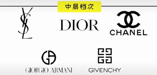 中间的品牌有圣罗兰、迪奥、香奈儿、阿玛尼、纪梵希,这些品牌知名度都很高,