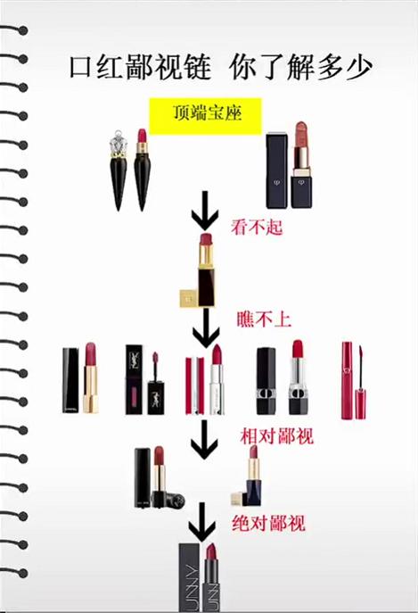 网上流传的一张图“口红鄙视链”备受关注,大部分都是大家熟悉的品牌。