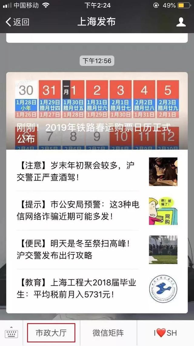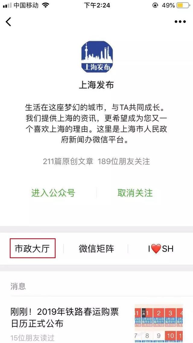 第一步:关注小布微信【上海发布】,选择【市政厅】↓