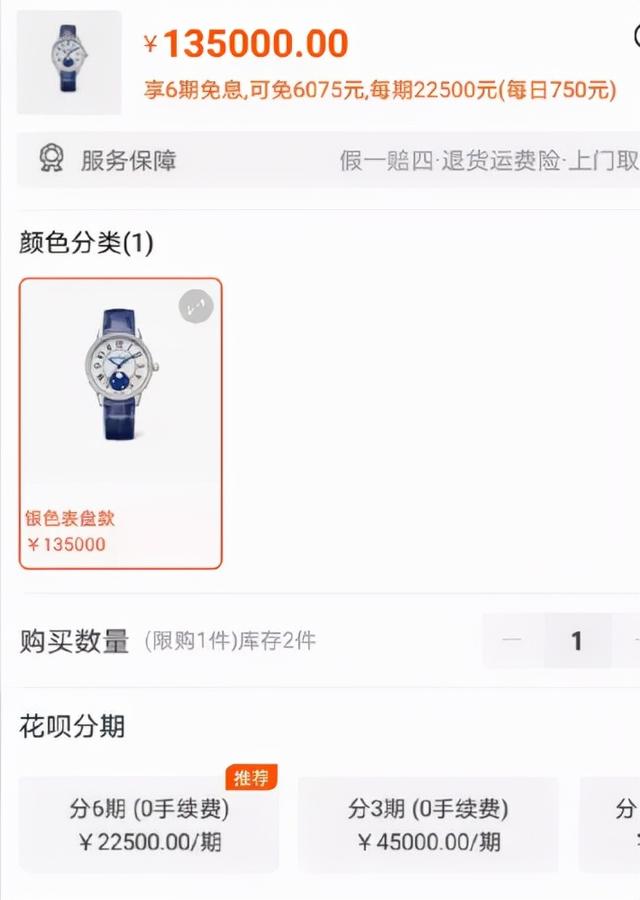 这是淘宝的“花呗分期付款”。这块手表每个月分六期付款,每期22500元,六期共计135000元,与手机售价一致。