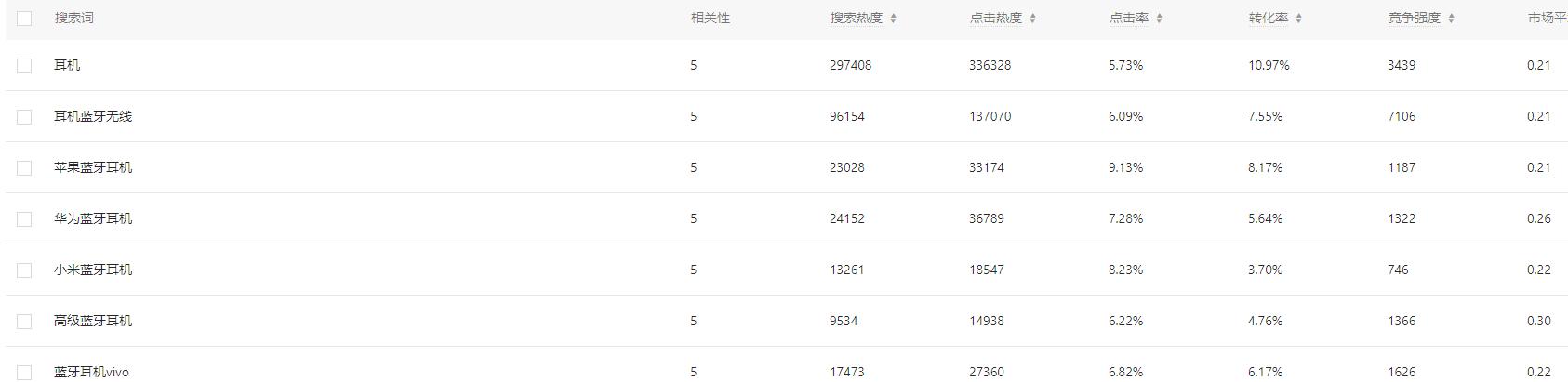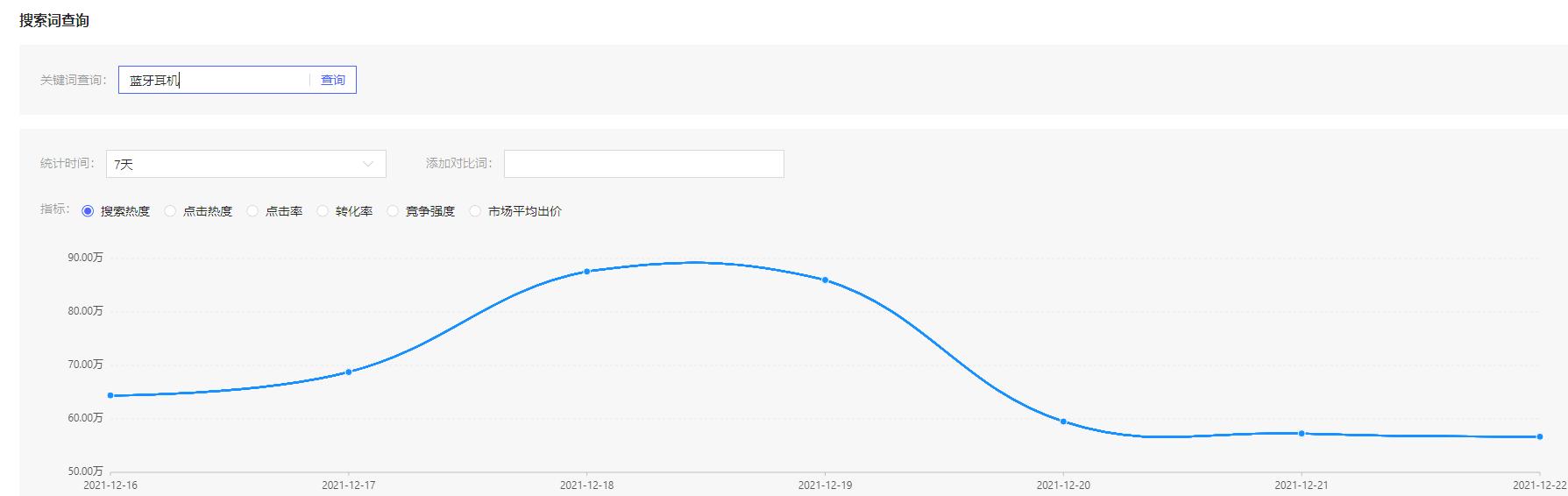 通过对行业类别下的搜索关键词进行排序,选择蓝牙耳机等关键词。让我们来看看这个单词。