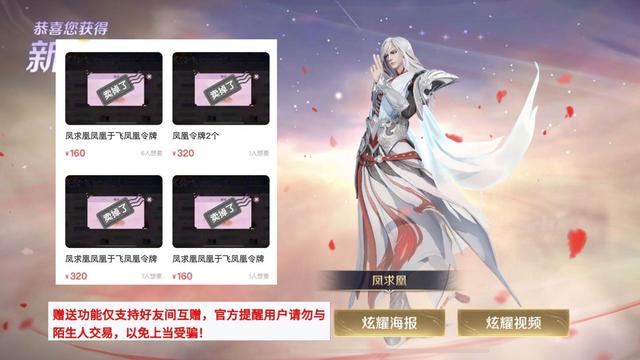 另一种方式是因为在这次抽奖中,大奖的凤凰令牌是可以赠送的,所以有玩家在凤凰令牌多的时候挂在一些二手平台上交易,想要的玩家可以通过加好友赠送的方式获得。现在,一枚凤凰令牌在一些交易平台上的价格只需120元左右就能获得。