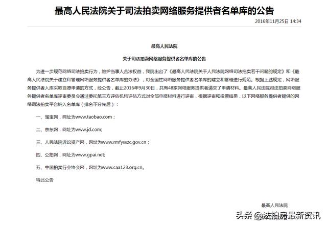 这七个平台都经过了最高人民法院审查委员会的审查。根据评审和投票结果,纳入整个司法拍卖的平台名单数据库。如果你有具体的相关文件,我已经帮你打出来了,你可以自己去查。一个是最高人民法院公布的2016年司法拍卖互联网服务提供者名单数据库,其中包括Taobao.com、JD.COM.com、人民法院诉讼Assets.com、Gongpai.com和中国拍卖业。