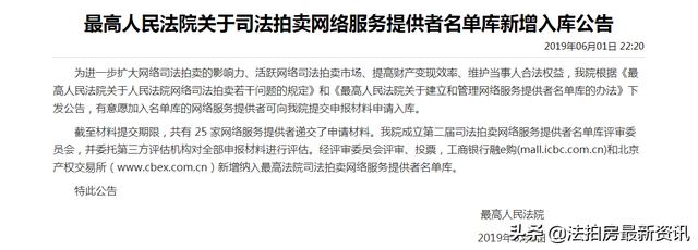 另一个文件是《最高人民法院关于2019年司法拍卖互联网服务提供者名单新入库的公告》,其中新增了工银融e购和北京产权交易所两个平台。