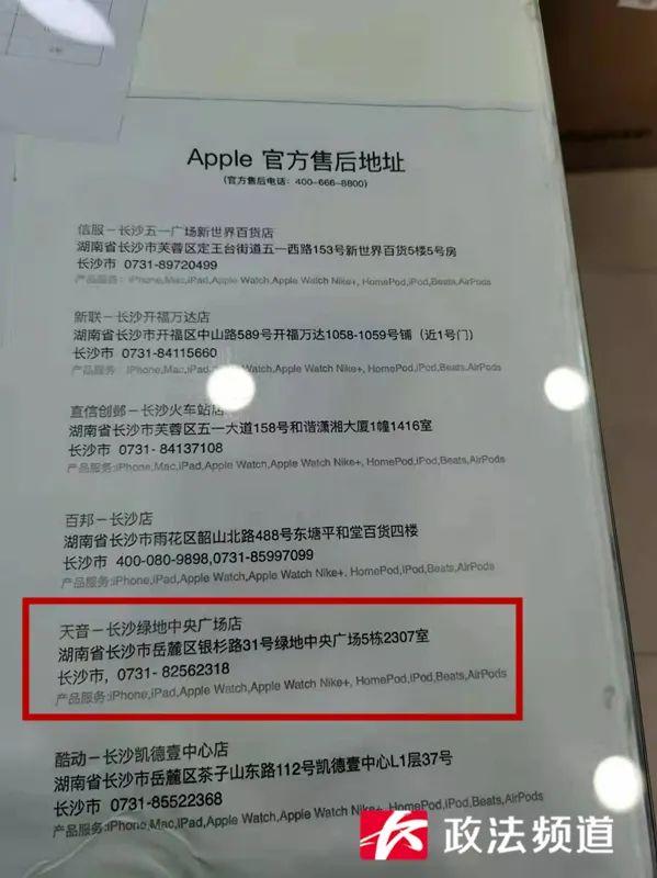 “我没有找到这个售后。我们长沙县没有售后点,只有一个发货点。”苹果官方客服说。