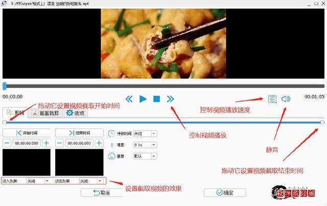 出现“视频剪辑”设置界面。拖动下方左侧的“开始时间”块和右侧的“结束时间”块,设置要截取的视频剪辑,并设置适当的参数。