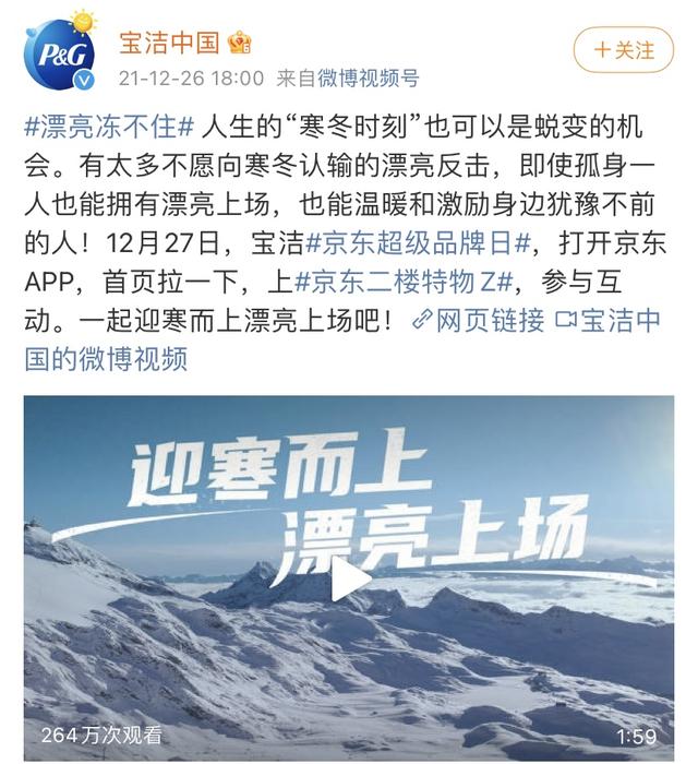面临寒冷的人会害怕吗?P&G品牌推出“迎冷,玩美”广告,从“勇敢的人也可能会害怕”的角度出发,用轻松幽默的方式,拍出面对寒冷的人并非生来勇敢。其实遇到困难的时候,他们会瑟瑟发抖,担心自己不够漂亮玩不下去。但那又怎样?大家都说辛苦,但他的身体是老实的。没有人生来就是勇敢的,选择前进就好,美丽是冻不住的。