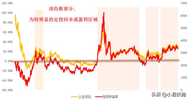 从上图可以看出,这种定投有四个明显的获利区域,而这四个区域并不都在牛市中。