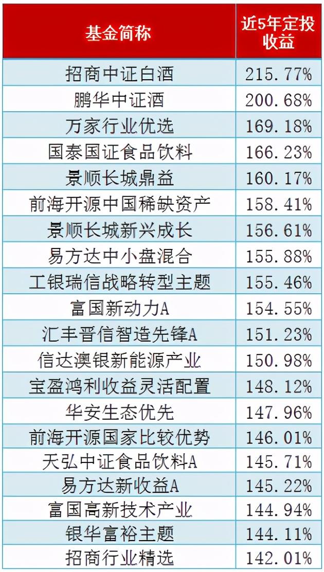 我们先来看看最近五年有哪些基金在定投收益排名靠前的位置。