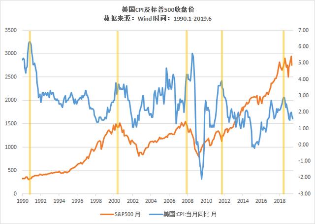 再来看美国,大家可能都在“羡慕”美国股市。我们可以通过观察标准普尔500和美国的CPI(通货膨胀)来更好地了解经济和股市之间的关系。更高的CPI可能对应更高的资产价格。从上世纪90年代初开始,黄线之间的间隔大概是10年、7年、4年、7年。