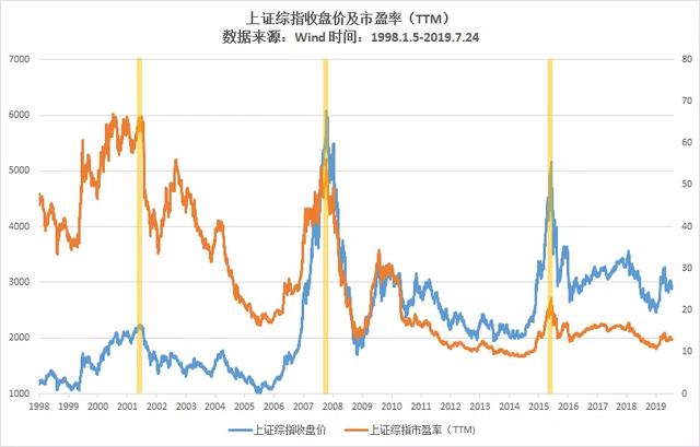 回到中国市场,以上证综指1998年以来的收盘价和估值(收益率TTM)作为市场的相对高点,可以看到2001年7月左右有一个峰值,2007年10月左右有一个峰值,2015年6月左右有一个峰值,前两个峰值间隔6年3个月,后两个峰值间隔7年8个月。所以从过去20年中国股市来看,差不多6-9年就有一个周期[/s2/]。