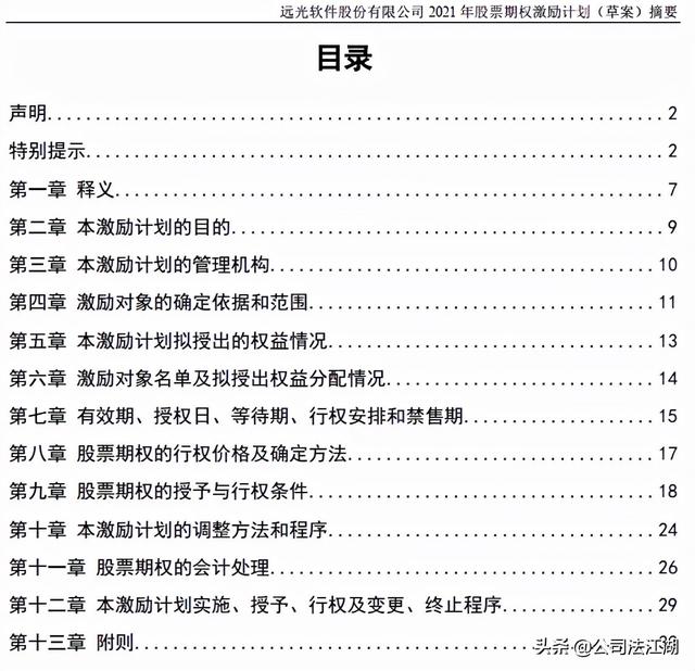 总草案目录如下(以远光软件股份有限公司2021年股票期权激励计划(草案)为例):