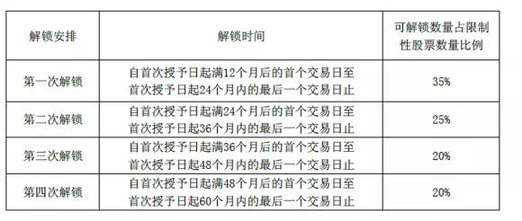 2.解锁:激励对象在未来48个月内应解锁4次,如下表所示: