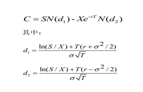 期权估值常用的模型有Black-Scholes-Merton公式、二项式模型(又称二叉树模型)和蒙特卡罗模拟。相对于二项式模型中概率的高度主观估计和蒙特卡罗模拟的极端复杂性,更常用的是具有可观测输入参数的Black-Scholes-Merton公式,简称“B-S模型”,其计算公式如下: