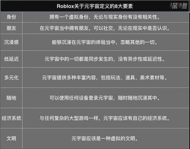 在Roblox定义的“元宇宙第一股”的元宇宙概念中,有八个关键特征,即身份、社交、沉浸式体验、低延迟通信、多样化、任何地方、经济制度和文明。
