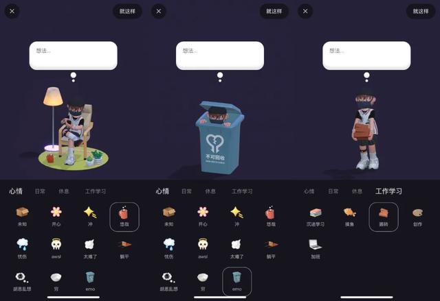 我可以给自己的头像设置“想法”(大致相当于微信状态),每个想法都有相应的动作和道具,大家看图就明白了。