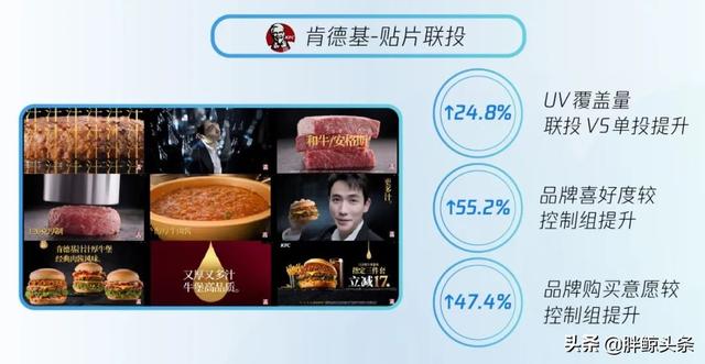 在肯德基新品“汁浓牛宝”的营销推广中,采用贴片联投进行测试,联投整体紫外线覆盖率比单投提升24.8%,品牌喜好度比对照组提升55.2%,品牌购买意愿比对照组提升47.4%。