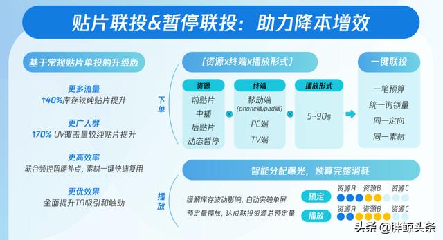 Á 贴片广告也升级了,贴片关节产品也升级了。通过扩大库存(在原贴片基础上增加暂停、中间插入、后贴等优质资源),引入了大量优质高价值人群,UV比纯贴片提升70%,可以帮助广告主更好的提升优质用户覆盖。针对投放灵活性的问题,贴片联合投放还将投放能力与现有的前置贴片广告对齐,在广告投放过程中可以智能分配曝光,完成投放周期内的指定曝光。