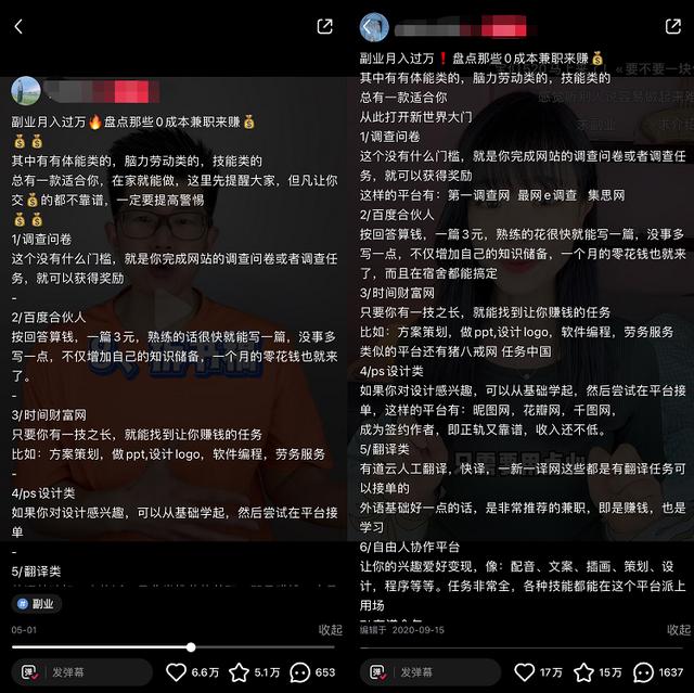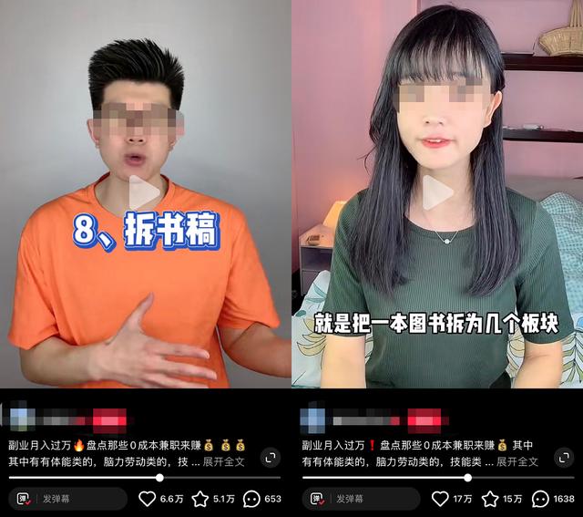 这些副业推荐的视频内容极其雷同,主持人大多嗓门大,鸡血十足,抄袭文案套路。