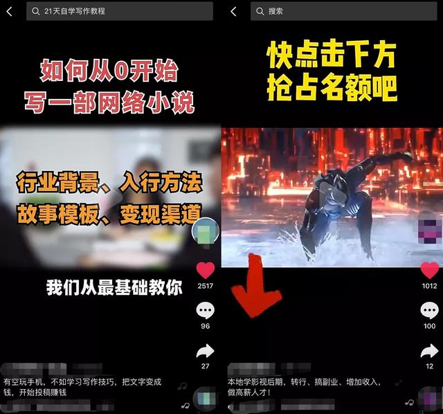 据观察,一些写作、绘图、配音、视频剪辑的培训机构以“开高薪副业”为名,投放短视频流广告,吸引用户报名课程,提升个人能力。
