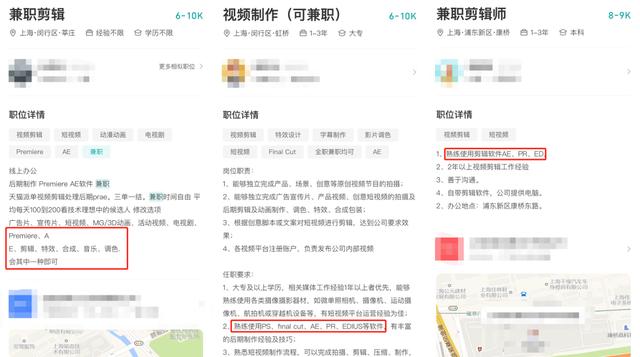 短视频网点跟我说实话,剪辑兼职数量太大,翻不过来。参考博主“月入过万”的说法,开了几个价位在6-10k的兼职,发现无一例外都注明求职者要掌握PR、AE等专业软件,与博主强调的“只用一部手机和几个简单的剪辑app就能接单”不符。