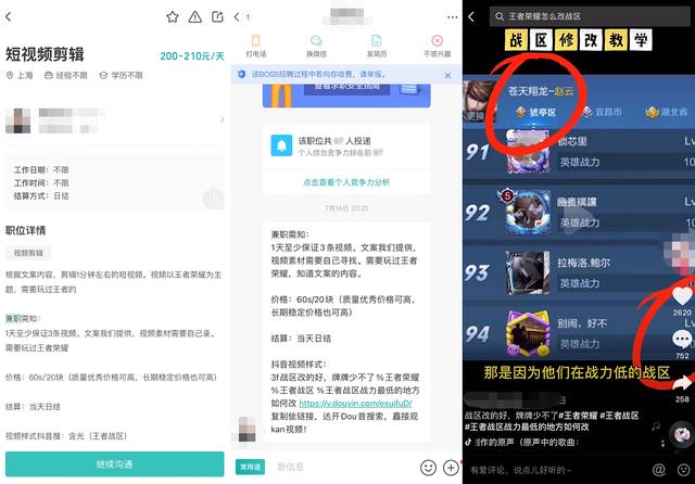 比如这个以王者荣耀为主题剪辑短视频的兼职,单个视频20元,对方提供文案,自己整理视频素材。看完样片,虽然难度不高,但是比较琐碎,预计一个小时可以编辑一个。如果达到日薪200元的收入标准,每天至少需要编辑10篇文章,耗时近10个小时,与主业工作时间相差无几。