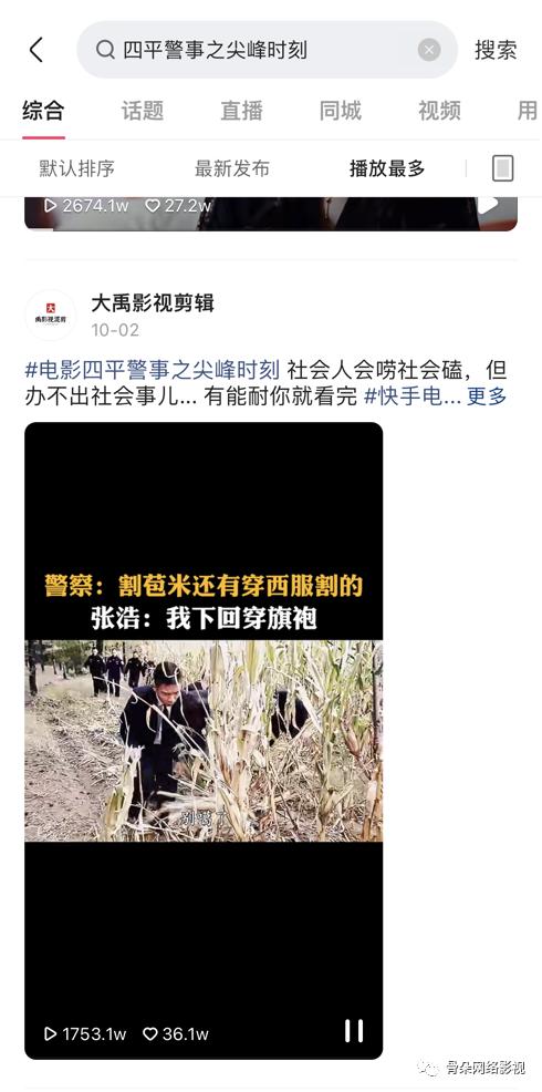 相比《怪物2:黑森林》《黄庙村》《地宫美人》《幸存者1937》的恐怖和悲剧,《鬼手神枪》《四平警政尖峰时刻》的基调就没那么沉重了。《鬼手神枪》以梦幻的方式与网剧《老九门》挂钩。里面军阀混战的情节,加上《老九门》张大佛爷的教训,唤醒用户关于民国和乱世背景的DNA。《四平警察的尖峰时刻》选取了《西装割玉米》等搞笑片段进行传播。视频播放量突破1000万,话题词#四平警察的尖峰时刻#更快登上了Aauto的热点榜。