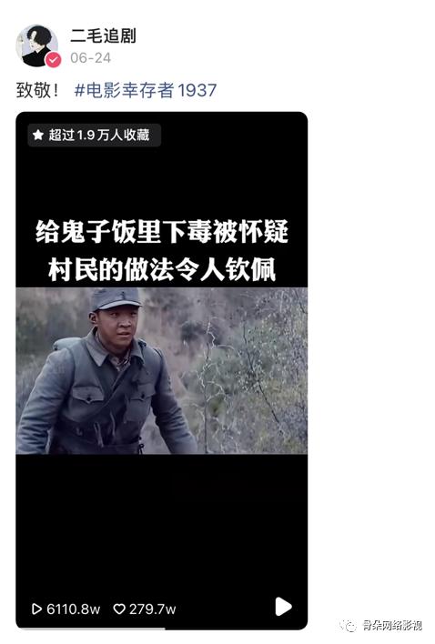 《幸存者1937》是一部以关大捷为背景的抗战题材,爱国主义和民族情怀自然是最好的宣传点。影片以“勿忘国耻”和“致敬先人”为主题,选取相应剧情进行传播,最高视频播放量达到6110.8万,赞量达到279.7万。a auto faster中的用户是大众情感交流的“温床”。