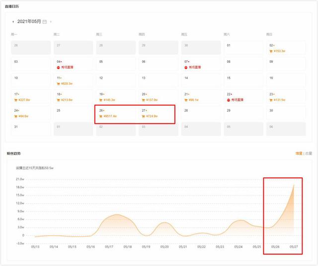除了以上几点,在一场直播中,关注粉涨粉落的情况也很重要。虽然26日“奎尔”带来了商品新高,但私域转换效果不佳。相比27号,27号的GMV不到前一天的十分之一,却能增加18.8万的粉,可见对于私域转化率来说,这次直播的效果比26号好太多了。