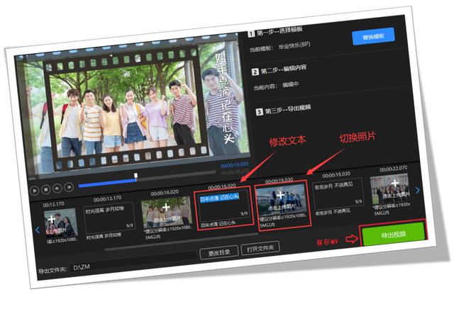 4.模板中的照片和文字可以修改,最佳图片分辨率为“1920x1080”,可以填充整个画布。这篇课文有字数限制。第三步,点击“导出视频”。