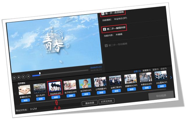 3.毕业视频模板做好了,直接加图就能生成MV。第一步,选择模板“快乐毕业”,可以先预览;第二步是单击编辑按钮。