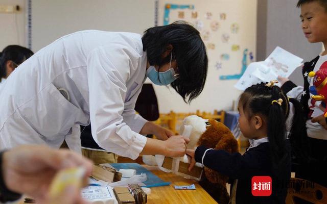 “泰迪熊医院”模拟在医院看病的实际过程,以“趣味互动、情景模拟”的形式帮助孩子了解看病的过程,缓解孩子对医疗环境的恐惧。在活动中,医学生志愿者扮演“医生”的角色,孩子们扮演玩偶的“父母”,把“宝宝”带到泰迪熊医院。