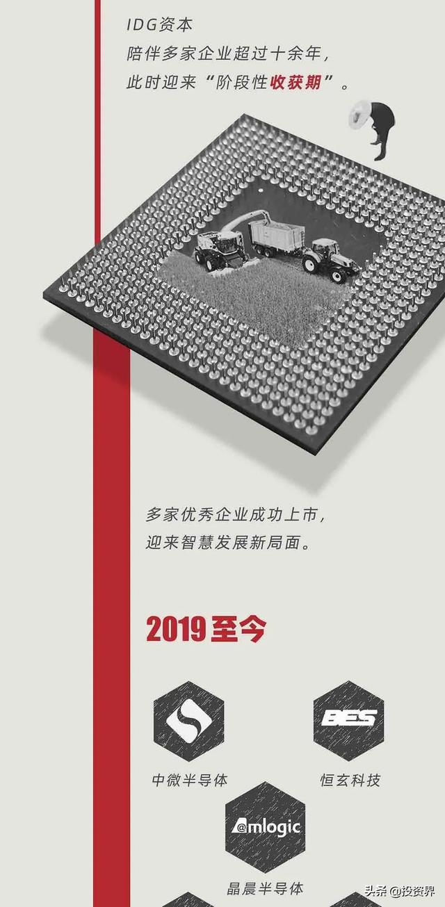 自2003年以来,IDG资本系统地布局半导体领域。20年来,其投资触角已在半导体设备、传感器、芯片设计、设计服务等多个领域布局。,半数以上的企业已经或即将上市。
