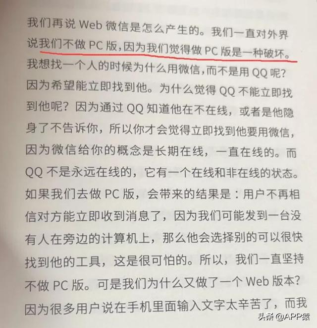 毕竟微信之父张小龙曾经在他的《微信背后的产品观》一书中描述过,微信本来就不想做PC版,因为那是一种破坏。后来是因为很多用户说手机输入文字太辛苦,经常坐在电脑旁边用手机输入文字。所以为了更好的解决输入问题,微信做了网页版,而不是真正的PC。