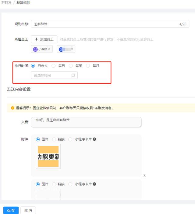 可以自定义时间,这样可以提前安排好要发送的消息,避免临时延迟,每天、每周、每月都可以安排消息,更好的运营客户。