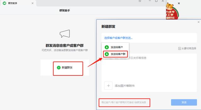 需要注意的是,每个客户群每天只能收到一条群发消息,也就是说,我们每天只能给每个客户群发一条群发消息,以免过度营销打扰客户。