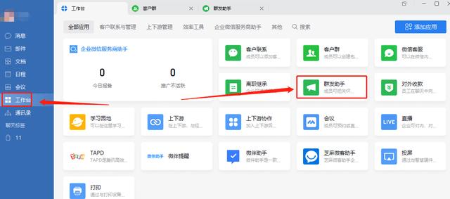 打开企业微信,找到“工作台”,点击“群发助手”。