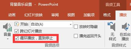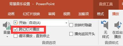 [音频工具]-[播放],勾选[跨幻灯片播放];