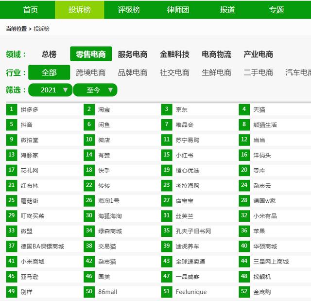 根据2021年至今“E-v-宝”受理的零售电商领域用户有效投诉量(按投诉量排名),有赞排名第14位。最新评级为“谨慎下单”。同样被投诉过的类似平台还有:拼多多、淘宝、JD.COM、天猫、Tik Tok、闲鱼、唯品会、熊猫生活、微拍堂、微店、Suning.cn、当当、海豚座、小红书、洋码头、花梨网、Aauto Quicker、橙心优选、寺库、红布林、转转、考拉等等。